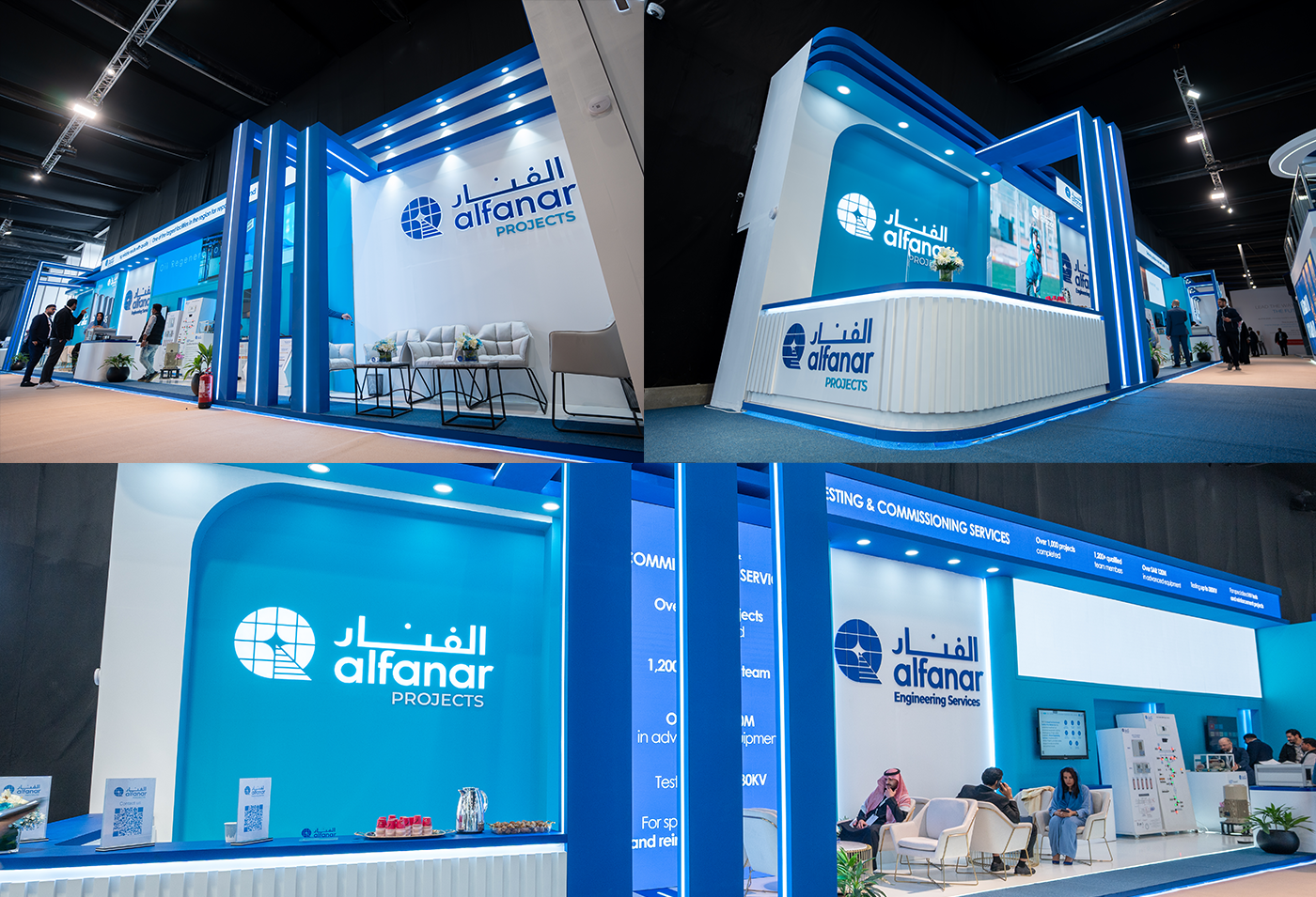 The booth followed Alfanar’s visual brand language with signature blue gradients and white tones, creating a clean, high-tech look. Every design detail—from lighting, layout, and material texture to digital motion graphics—was aligned to enhance user engagement and visitor flow.