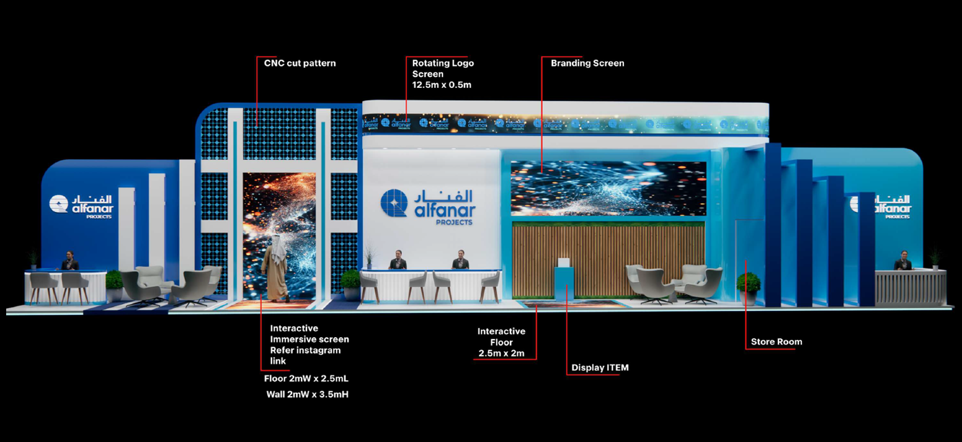 Collaboration with on-ground production teams, architects, and AV technicians ensured precise execution of the design vision. The final outcome was a modern, bold, and immersive booth that successfully captured attention and strengthened Alfanar’s brand visibility at the event.